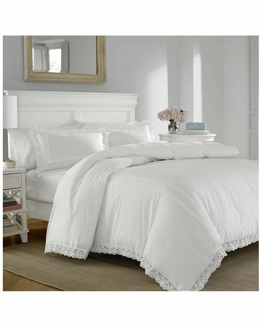 - Design details: with a nod to the past, this white on white cotton ensemble trimmed with crocheted lace adds romance and modern femininity to your bedroom decor. classic elements look fresh in this streamlined update and cool, crisp cotton adds welcome comfort. with annabella, you can create an elegant, restful retreat you will enjoy coming home to. twin comforter set includes: one comforter (86″x63″) and one sham (21″x27″). full/queen comforter set includes: one comforter (92″x88″) and two shams (21″x27″). king comforter set includes: one comforter (92″x106″) and two shams (21″x37″).