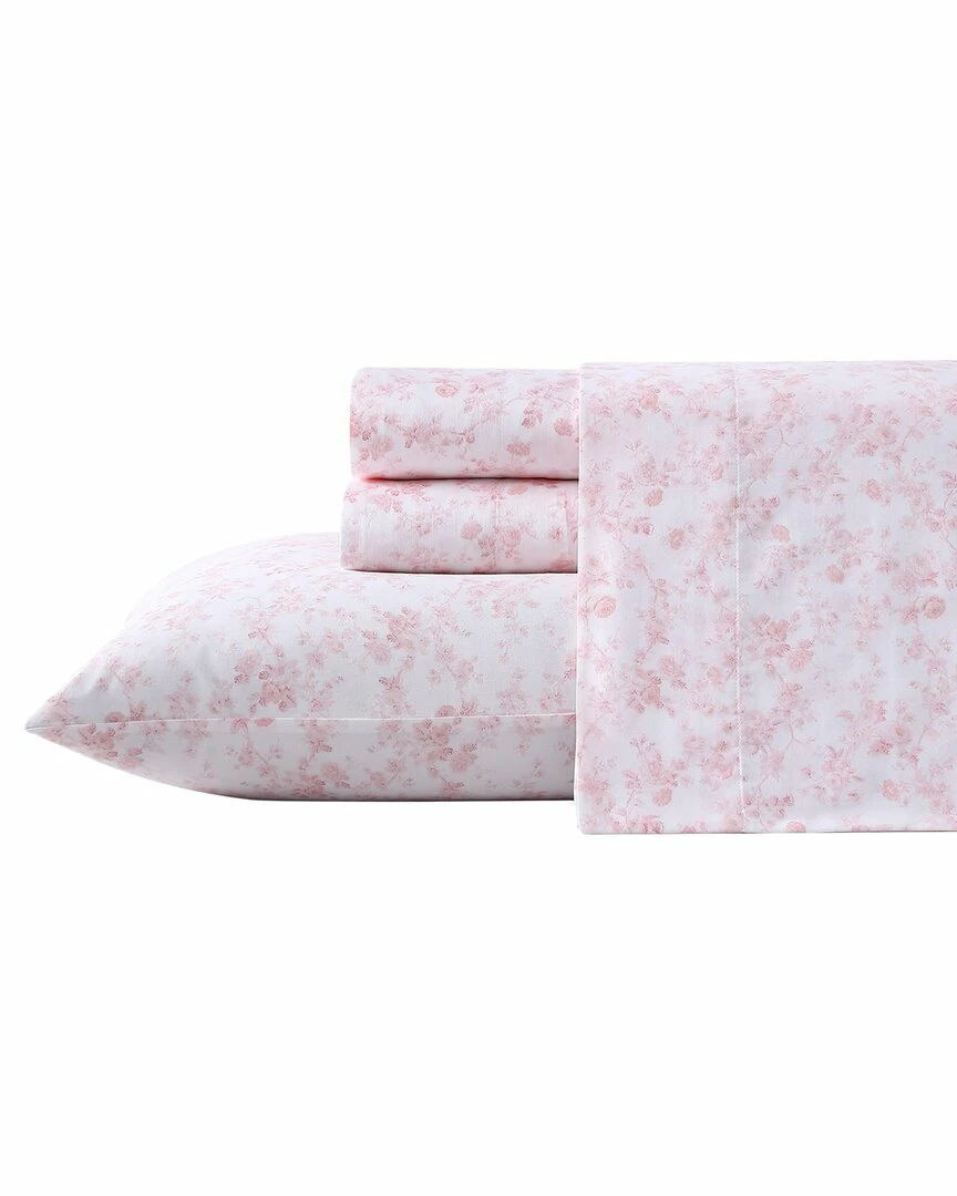- Design details: sateen cotton sheets are smooth, sleek and soft, set includes a fully elasticized fitted sheet- premium encased elastic runs continuously around all four sides to keep the fitted sheet in place; 15″ fitted sheet pocket depth – fitted sheet fits mattress up to 18″,pillowcases have a standard opening with 4″ hem, oeko-tex standard 100 tested and certified to contain no harmful substances. better for you and for the environment, laura ashley bella sheet set has a pale pink floral print on white ground