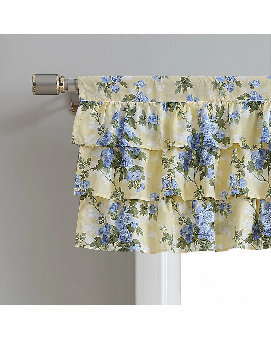 - Design details: this cotton valance is soft and light weight, valance has 3 tiers of ruffles and a 3″ rod pocket; valance is not lined,,, a sunny buttercup yellow background with bright and pale blue roses