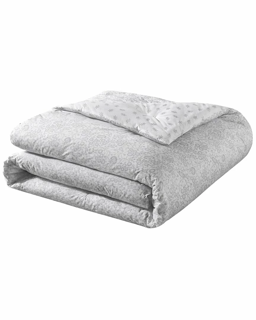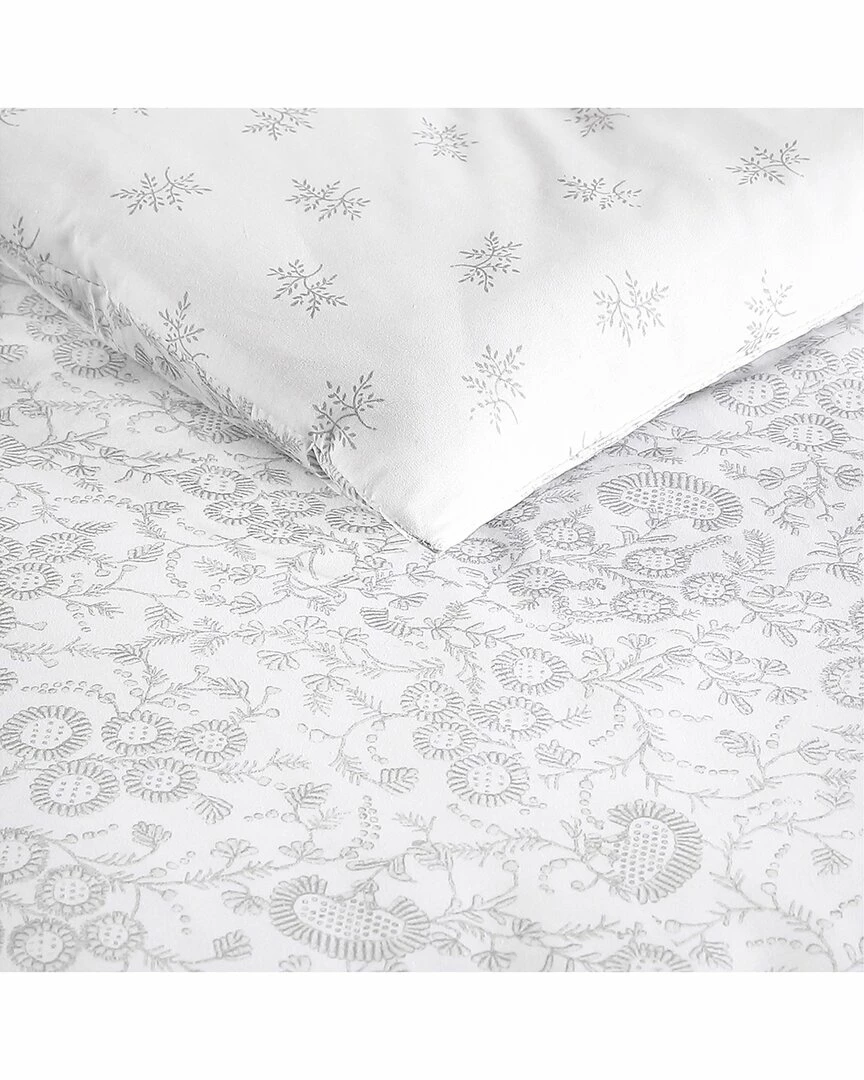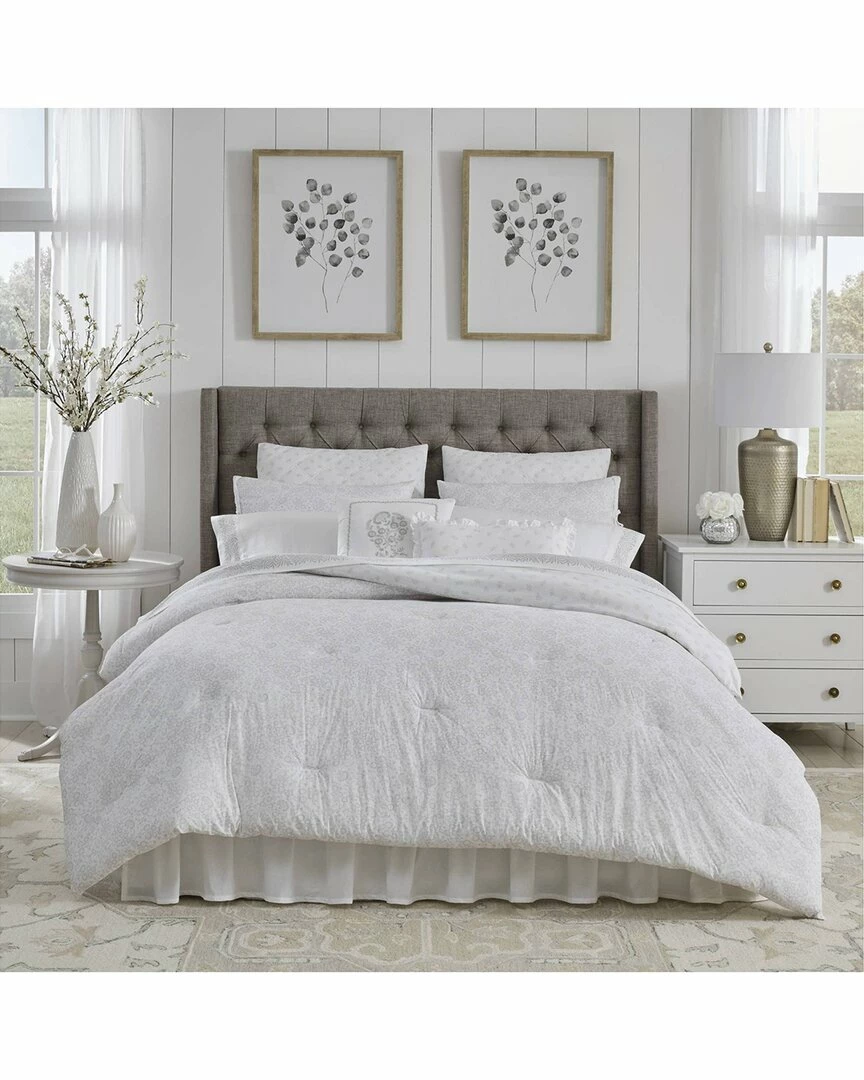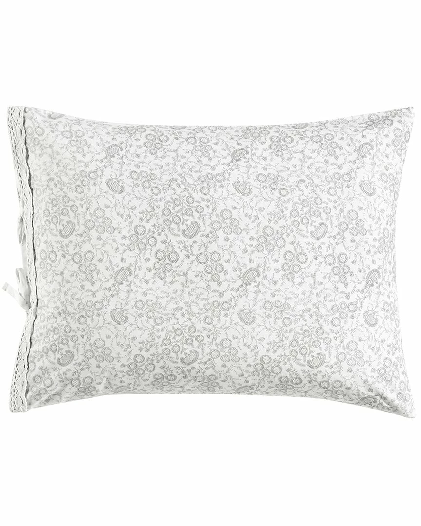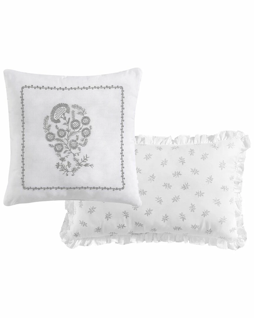 - Design details: antique lace is the inspiration behind the airy cerie comforter and sham bonus set, which includes all the pieces for a total bed makeover. 100% cotton comforter in white with pale grey printed lace design reverses to white with scattered grey sprigs. standard and king shams have lace trim closures with bow ties. a quilted chain stitch adds a feminine touch to the european shams. breakfast pillow is edged in a ruffle, and square pillow has beautiful grey embroidery. comforter and pillows are filled with 100% poly. comforter is medium weight for year-round use. set contains one comforter and two standard or king shams (one sham for twin size), two european shams and two decorative pillows. comforter and shams are machine washable for easy care. spot clean pillows.