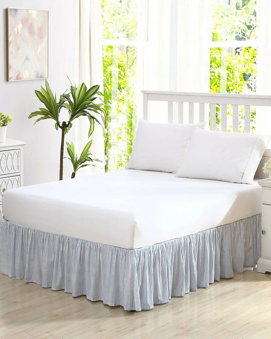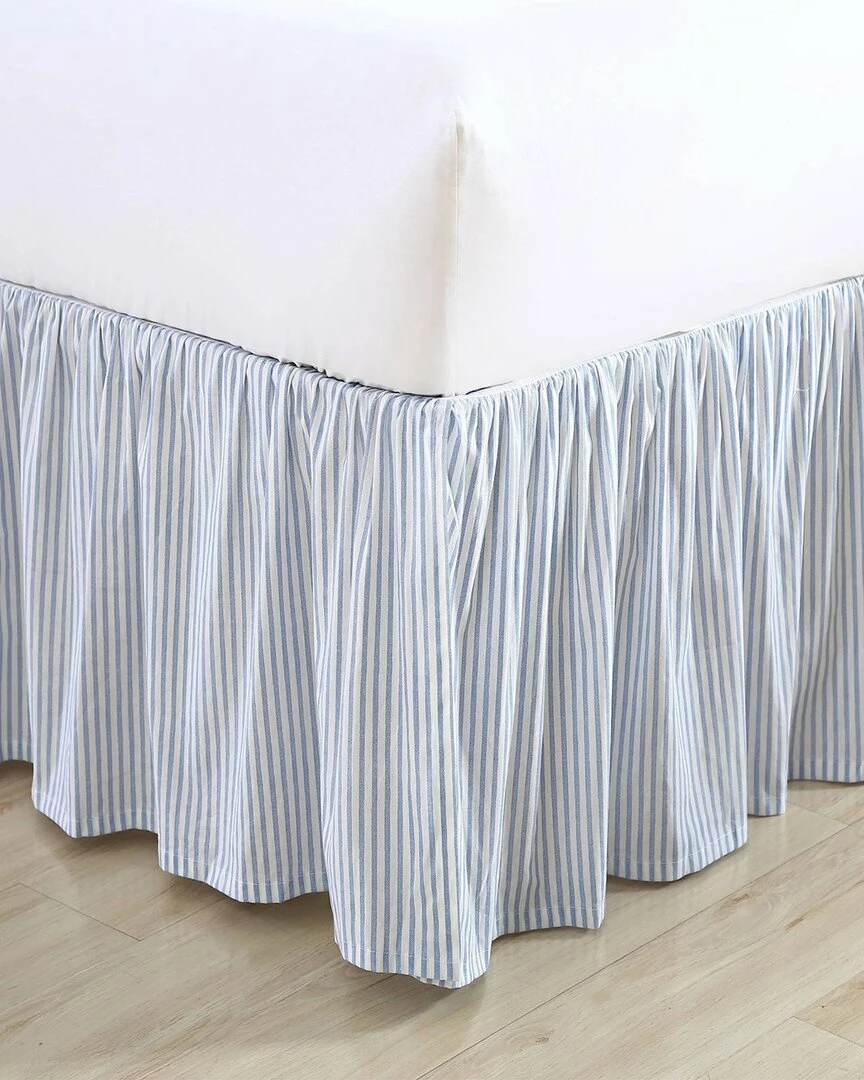 - Design details: the laura ashley classics ruffled bedskirt is printed with a light blue and white ticking stripe that coordinates with many laura ashley bedding collections. it adds an elegant touch to finish off your bedding ensemble