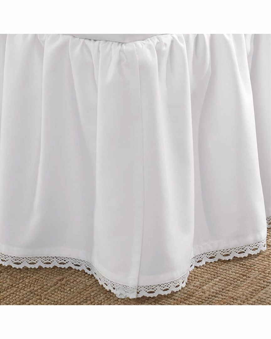 - Design details: finish your bed with a look of charm and elegance with the laura ashley ruffle bed skirt. this accessory is decorated with a ruffled edge using soft cotton with a crochet accent. available in a crisp white color. bed skirt drop is 14 inches. sizes available: twin, full, queen, and king.
