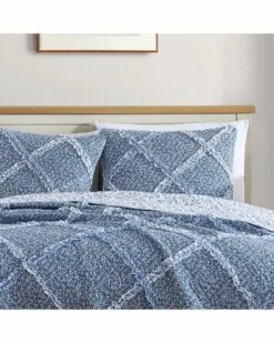 - Design details: lightweight yet warm, ideal for year-round use and layering; pre-washed for extra softness, filled with a blend of 80% cotton 20% polyester for warmth and durability, included shams have a back envelope closure, laura ashley is conscious of the environment: we have eliminated plastic from packaging – quilt sets are neatly folded and secured with a ribbon; cotton is biodegradable and requires less energy to process than other fibers, tiny white floral print on dark blue ground with crisscrossing ruffles in light blue and white print, reversing to white ground with light blue and grey floral print
