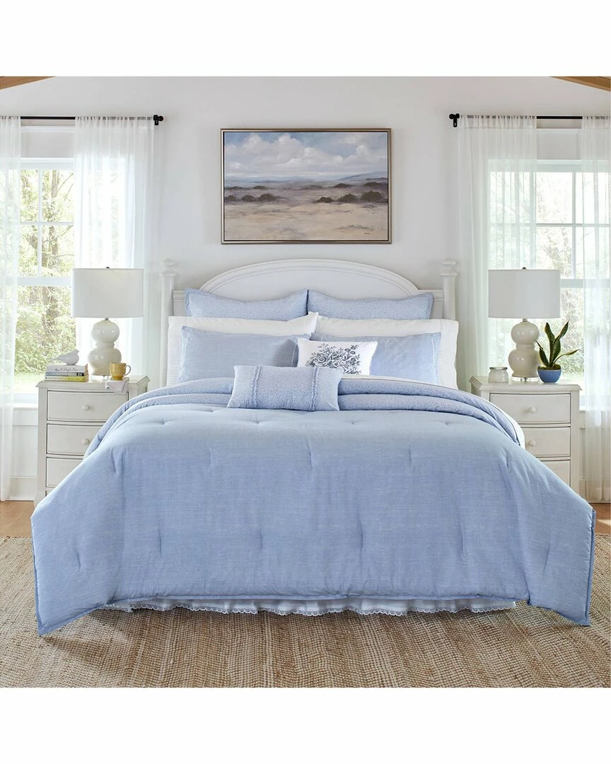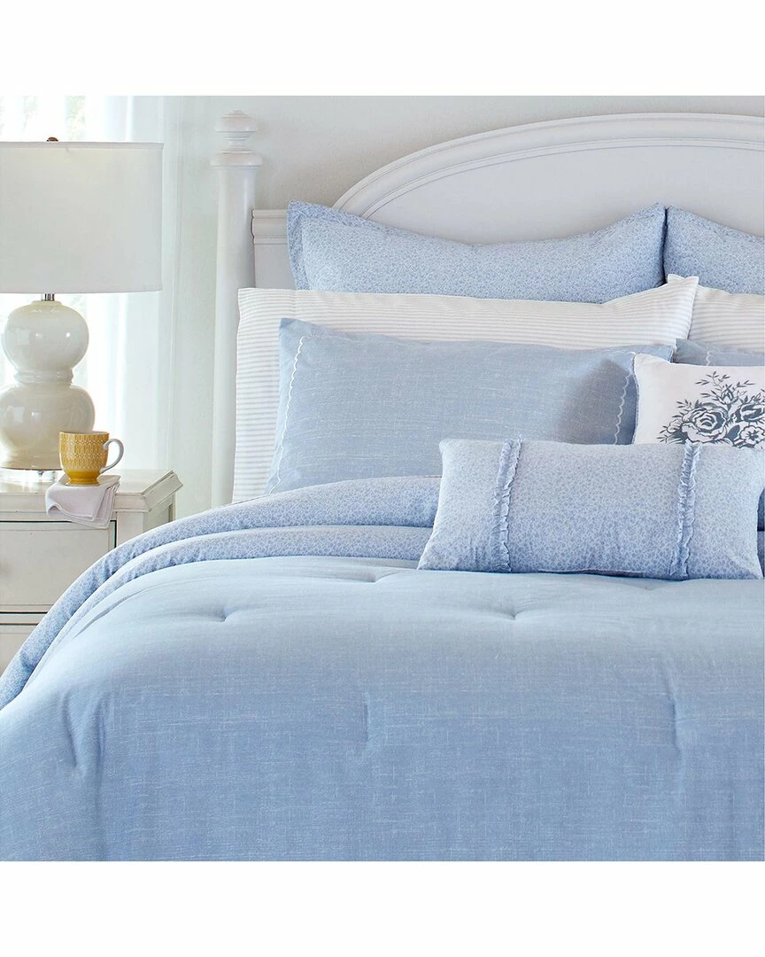 - Design details: comforter is a medium weight and has a smooth feel, comforter fill- 100% polyester: 9 oz. fill weight per square inch, included standard and king shams feature a side euro cap closure, euro sham has two piece back envelope closure,oeko-tex certified, the mark of excellence for products that are healthy for you and healthy for the environment., comforter and shams feature a soft chalk blue printed texture, reverses to pale blue with medium blue small floral print, euro sham and breakfast pillow feature the same tonal blue small floral, square pillow is white with medium blue embroidery
