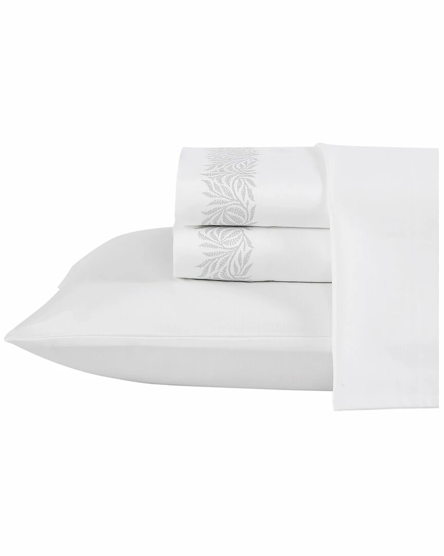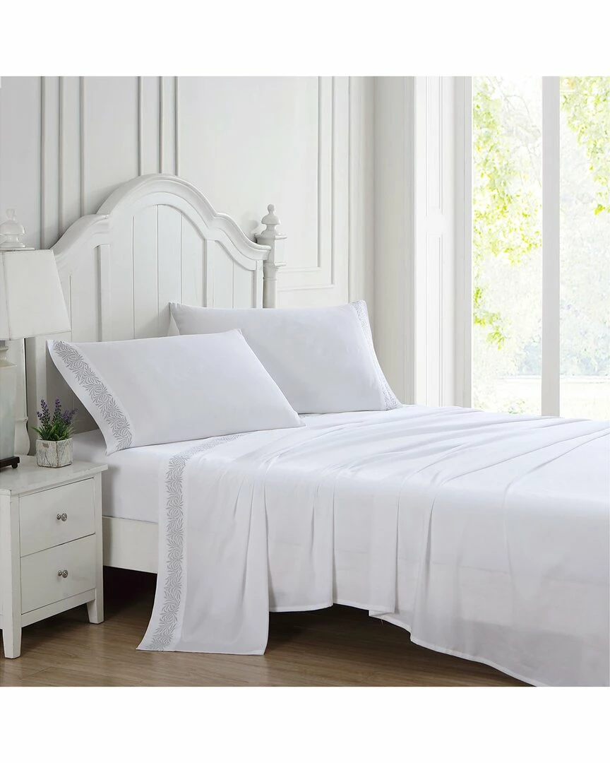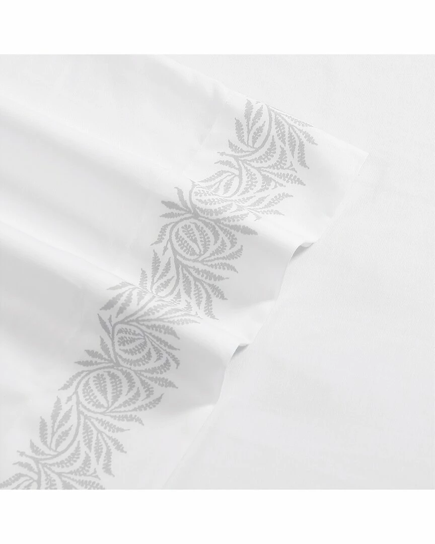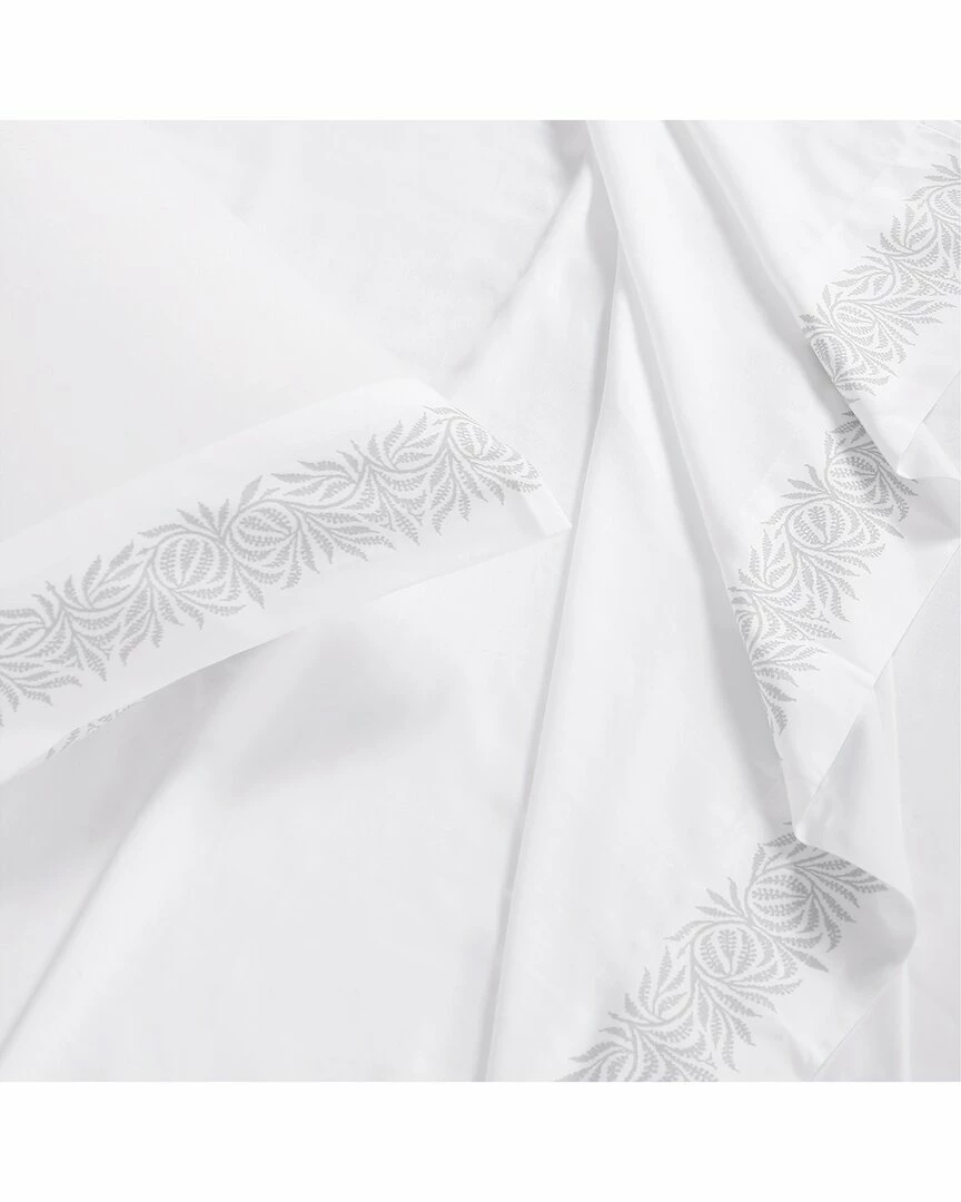 - Design details: the laura ashley francesca’s border sheet set has a classic english garden design with graceful grey leaves bordering the flat sheet and pillowcase hem. constructed with a solid white ground 300 thread count silky smooth cotton sateen, these sheet sets add a luxurious touch to any bedding. the set includes 1 flat sheet, 1 fitted sheet and 2 pillowcases. machine washable for easy care