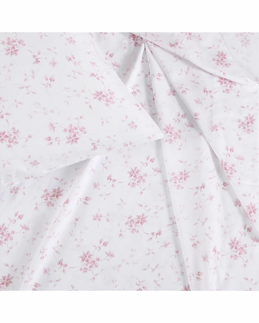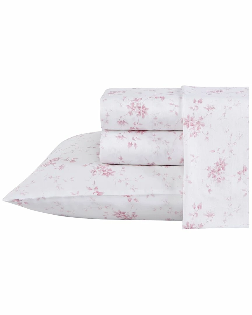 - Design details: the laura ashley garden muse sheet set is bursting with tea roses in this country cottage print. constructed of a solid white ground scattered with pink flowers, these 300 thread count silky smooth cotton sateen sheets add cosy charm to your bedroom. the set includes 1 flat sheet, 1 fitted sheet and 2 pillowcases. machine washable for easy care