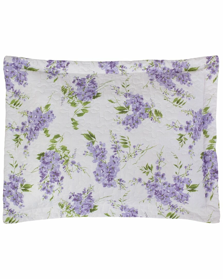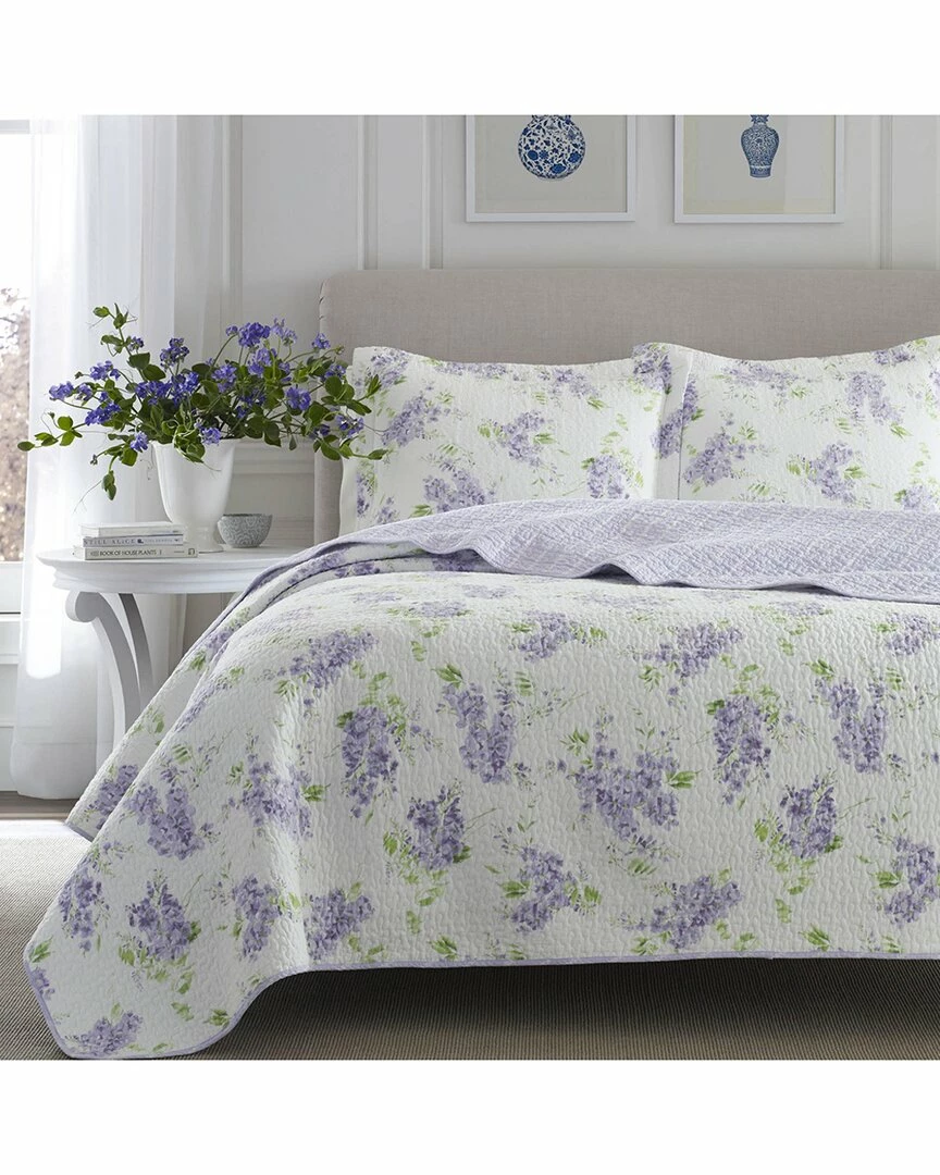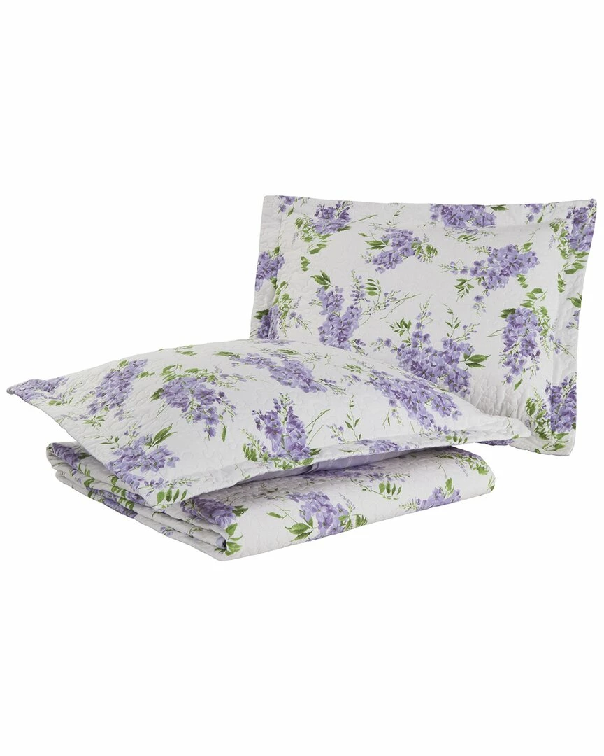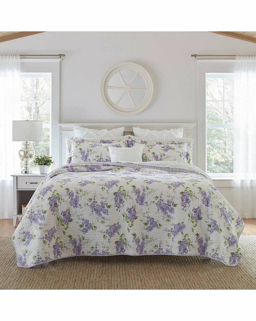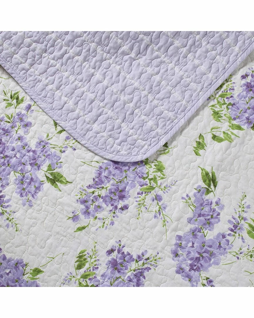 - Design details: lightweight yet warm, ideal for year-round use and layering; pre-washed for extra softness, filled with a blend of 80% cotton 20% polyester for warmth and durability, included shams have a back envelope closure, laura ashley is conscious of the environment: we have eliminated plastic from packaging – quilt sets are neatly folded and secured with a ribbon; cotton is biodegradable and requires less energy to process than other fibers, wisteria blossom print in pale lilac with deeper purple accents and bright green leaves, reversing to a white vine stripe printed on soft lilac