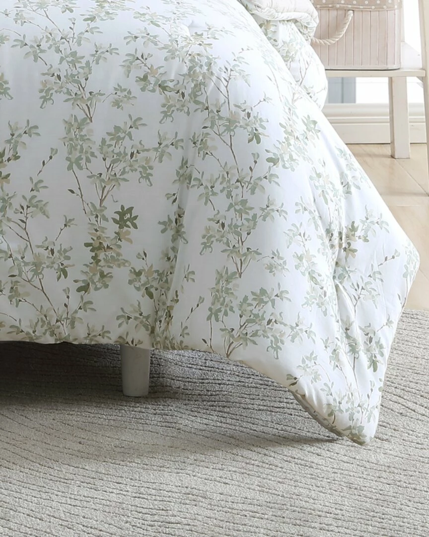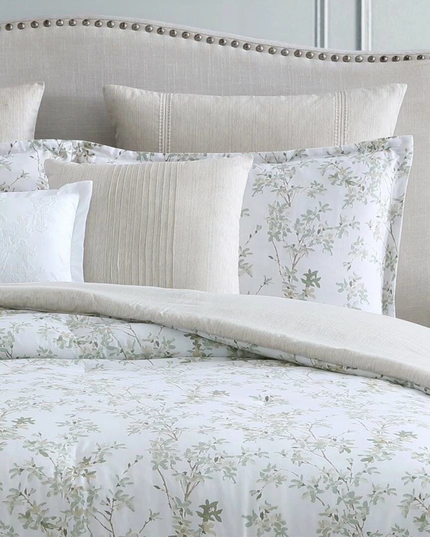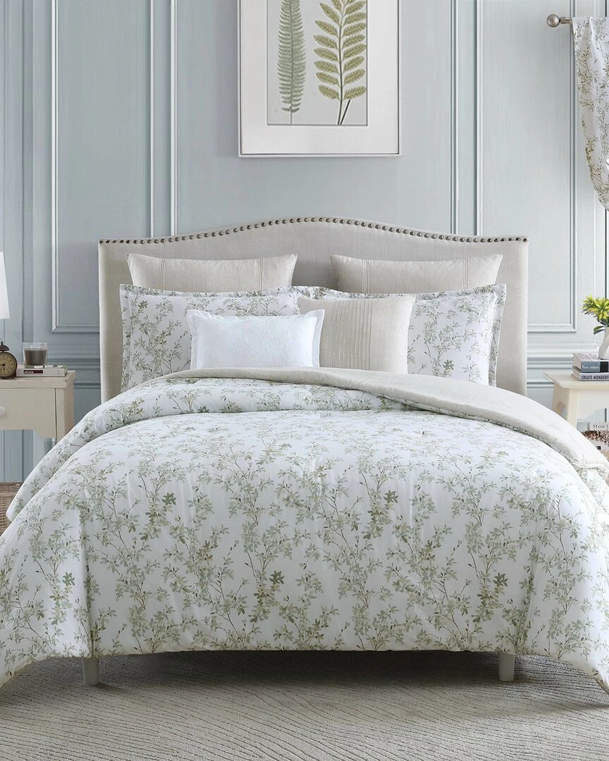 - Design details: no matter the season, you can always wake up to spring with this delicate design of leafy branches. hues of spa green, beige and white is a classic pairing that will transform your bedroom into a relaxing retreat. reverses to a neutral beige stripe. laura ashley lindy twin set includes comforter, standard sham, european sham and 2 decorative pillows with twin size; full/queen set includes comforter, two standard and two european shams, 2 pillows; king set includes comforter, two king and two european shams, 2 pillows