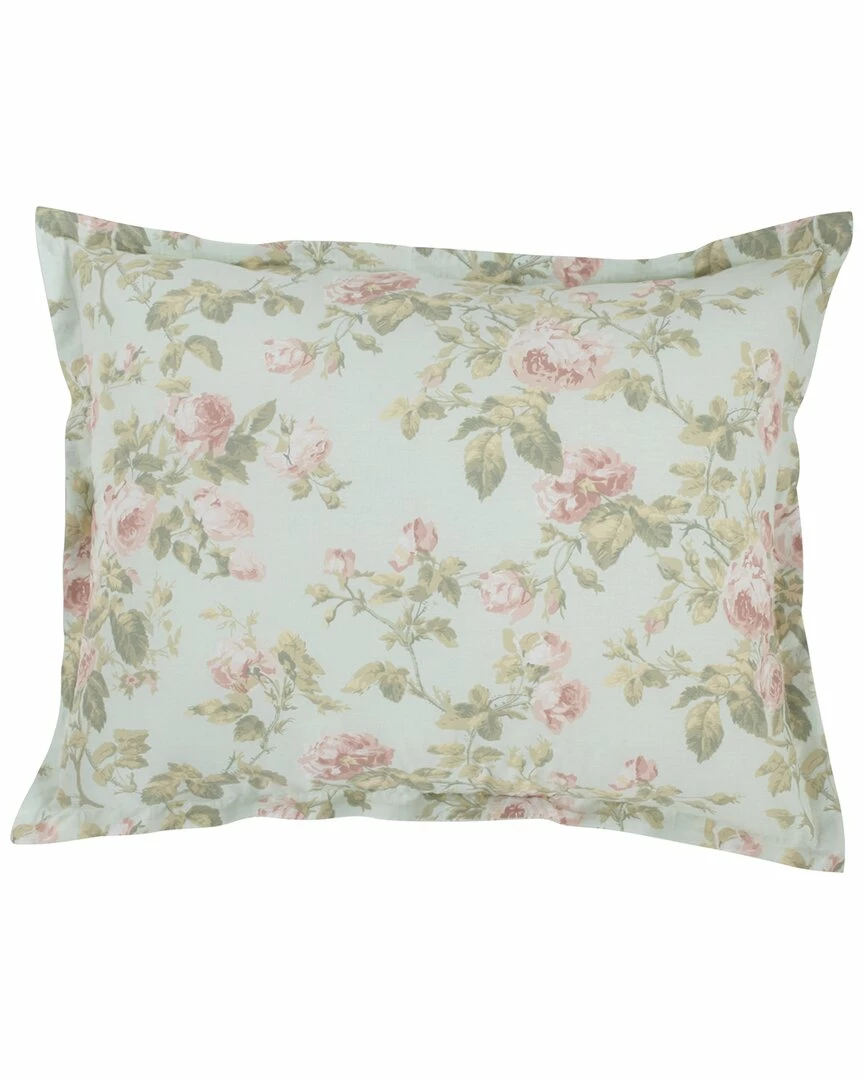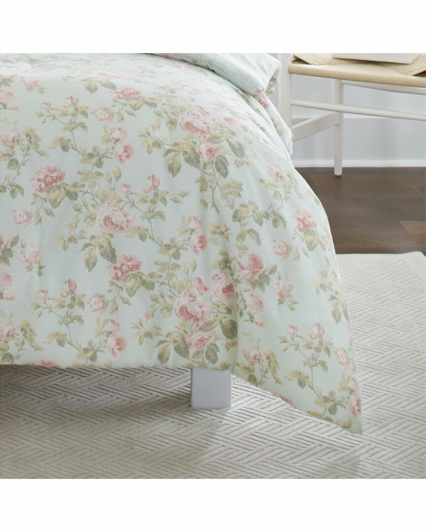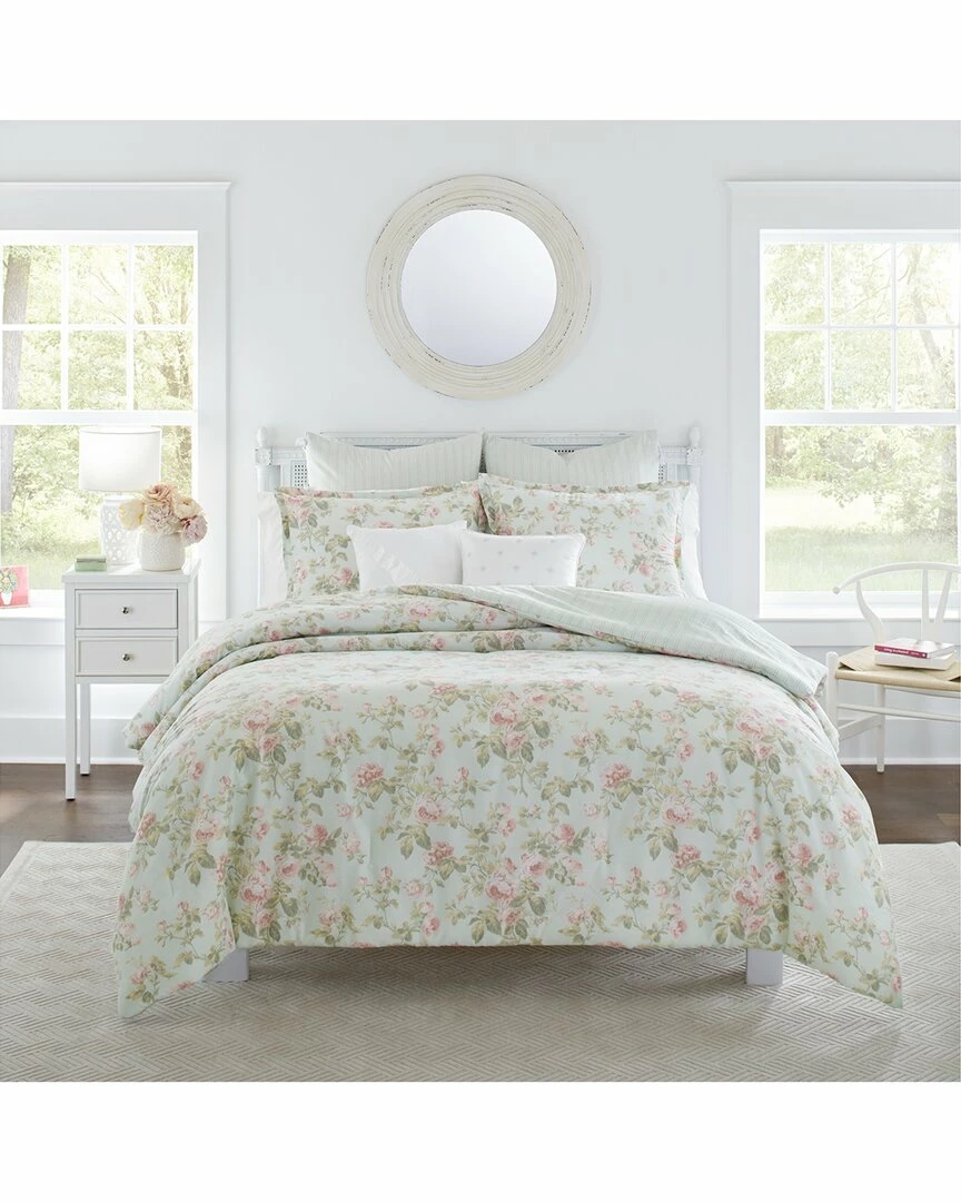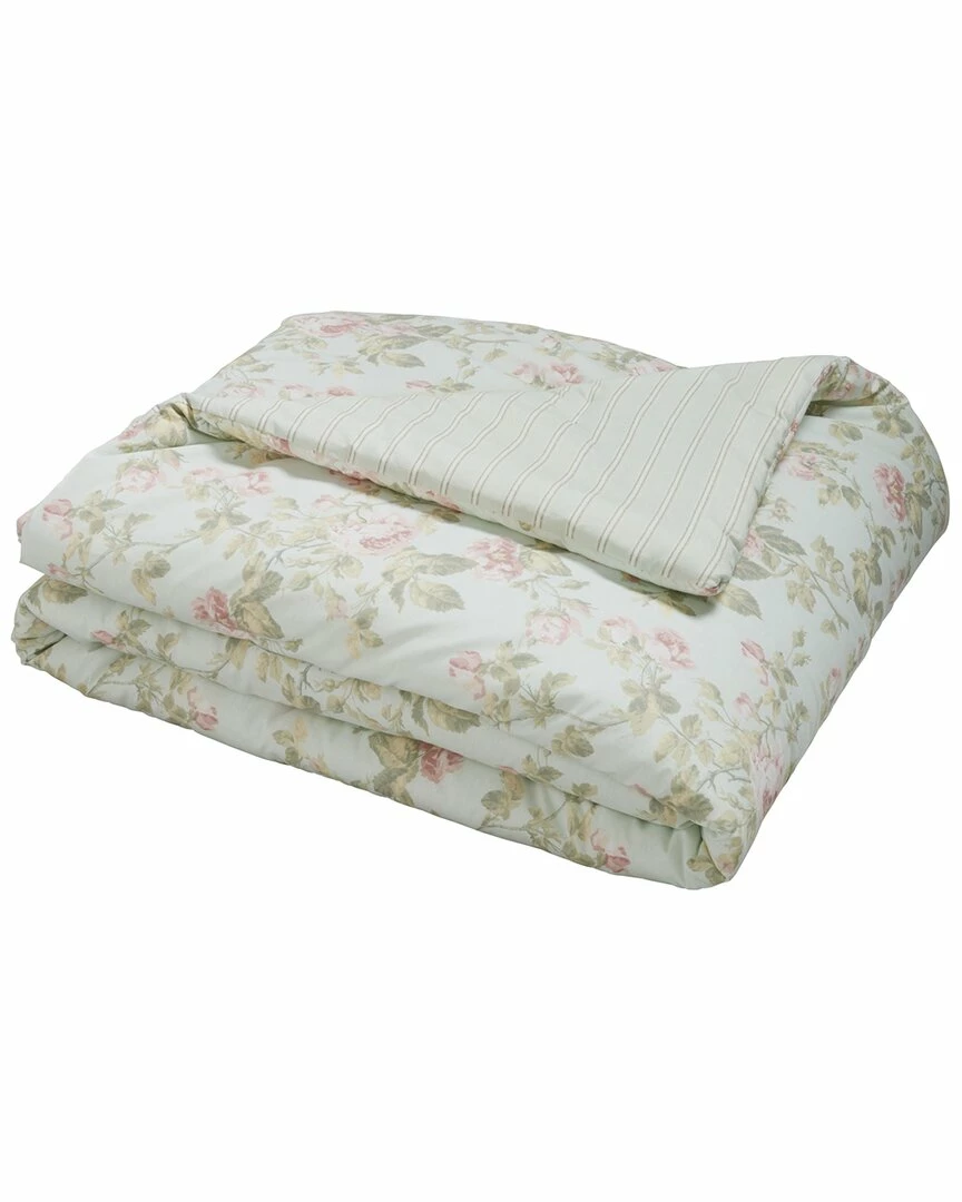 - Design details: wake up to spring with a new carefree bedding set from the laura ashley archive. the madelynn bonus comforter set features antique rose and sweet pink floral motifs on a soft seafoam green cotton ground. the comforter reverses to a ticking stripe for layered pattern interest. the additional european shams feature a european closure with additional decorative ties. each set includes two decorative throw pillows that promote the feeling of springtime with their stylish ruffles and embroidered design. comforter features a polyester filling and the included shams feature an easy overlap closure. this exquisite ensemble is machine washable for easy care. twin comforter set: one comforter (86″l x 63″w), one standard sham (21″l x 27″w), one european sham (26″l x 26″w), one throw pillow (16″l x 16″w) and one sham (12″l x 16″w). full/queen comforter set: one comforter (92″l x 88″w), two standard shams (21″l x 27″w), two european shams (26″l x 26″w), one throw pillow (16″l x 16″w) and one sham (12″l x 16″w). king comforter set: one comforter (92″l x 106″w), two king shams (21″l x 37″w), two european shams (26″l x 26″w), one throw pillow (16″l x 16″w) and one sham (12″l x 16″w).