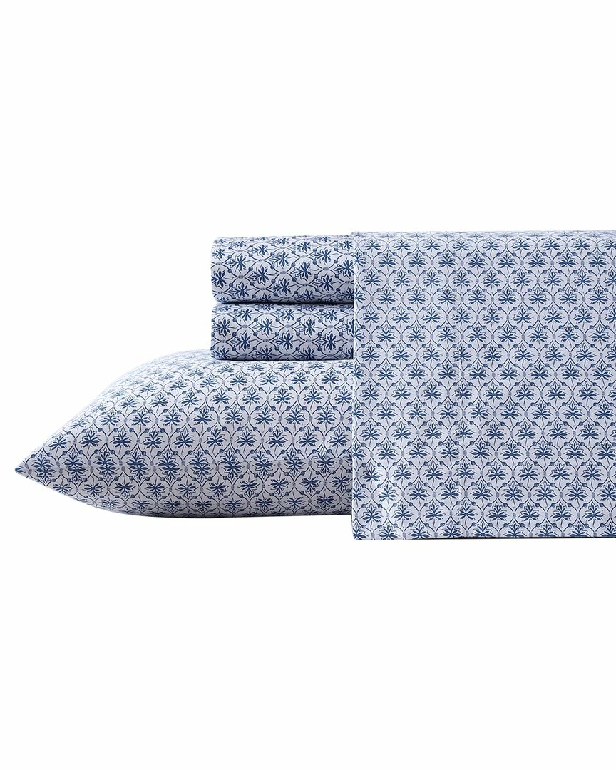 - Design details: sateen cotton sheets are smooth, sleek and soft, set includes a fully elasticized fitted sheet- premium encased elastic runs continuously around all four sides to keep the fitted sheet in place; 15″ fitted sheet pocket depth – fitted sheet fits mattress up to 18″,pillowcases have a standard opening with 4″ hem, oeko-tex standard 100 tested and certified to contain no harmful substances. better for you and for the environment, laura ashley rosemarie sheet set is a medium blue geometric tile print on white ground
