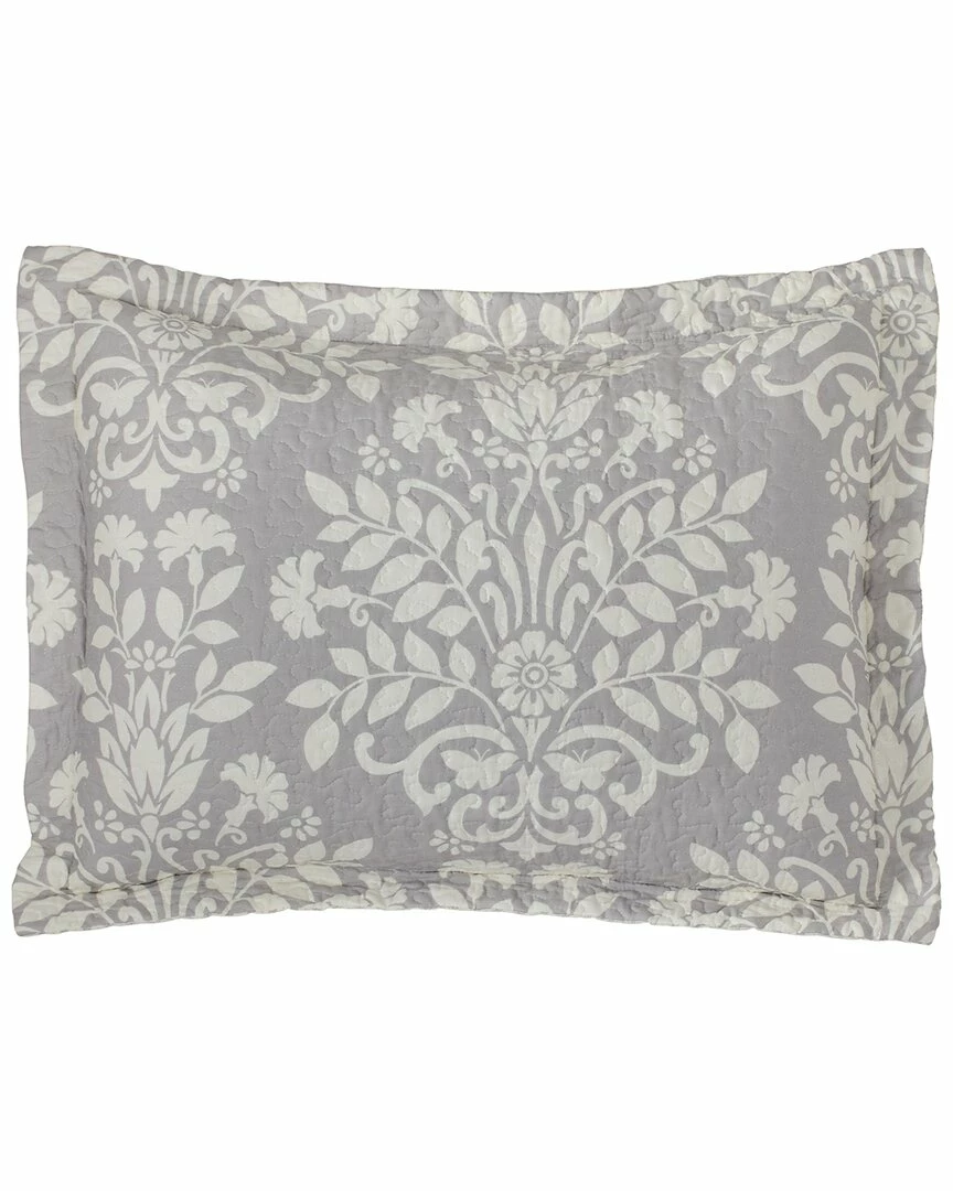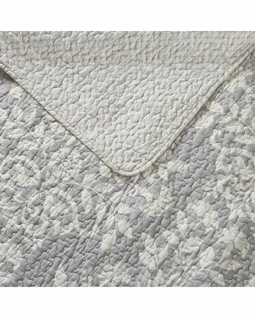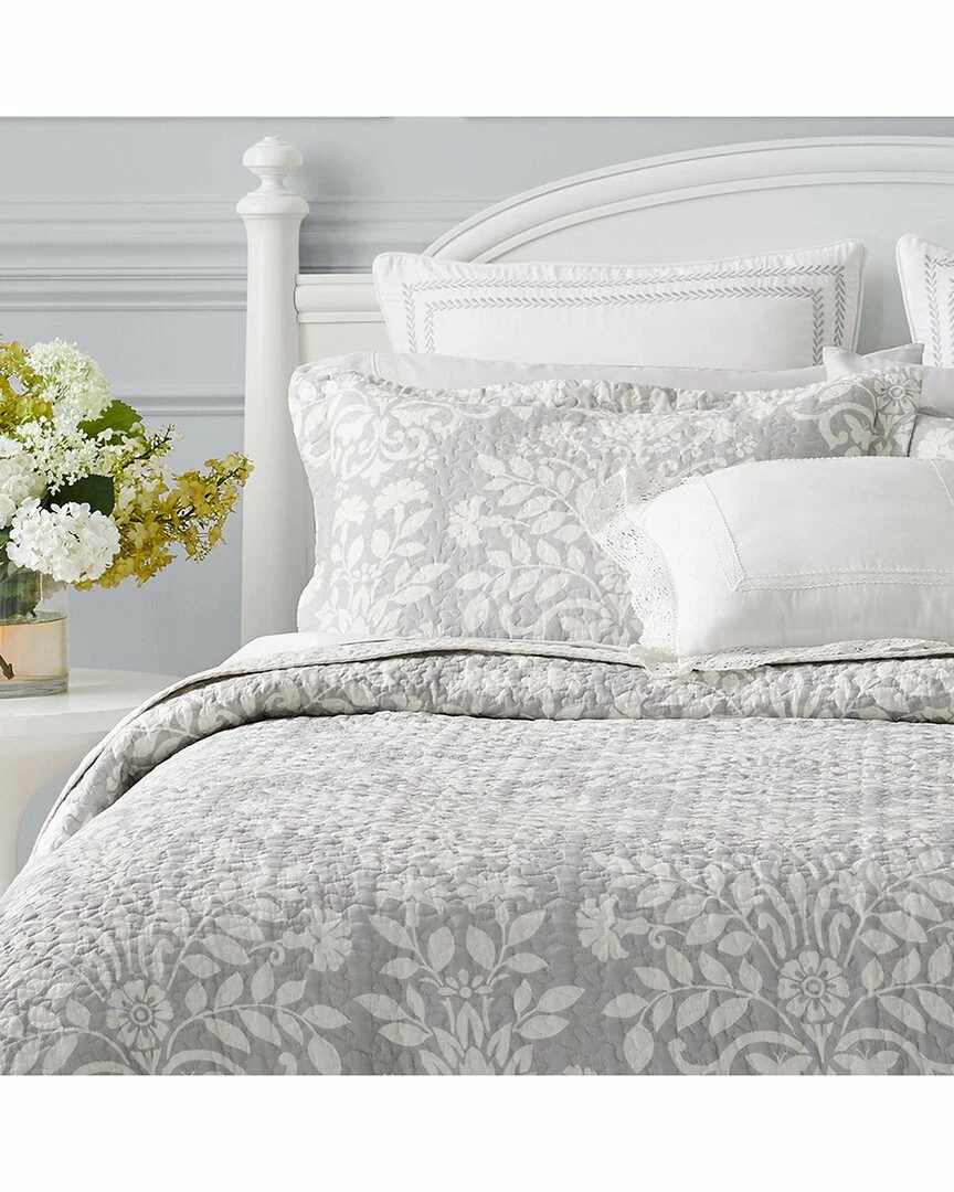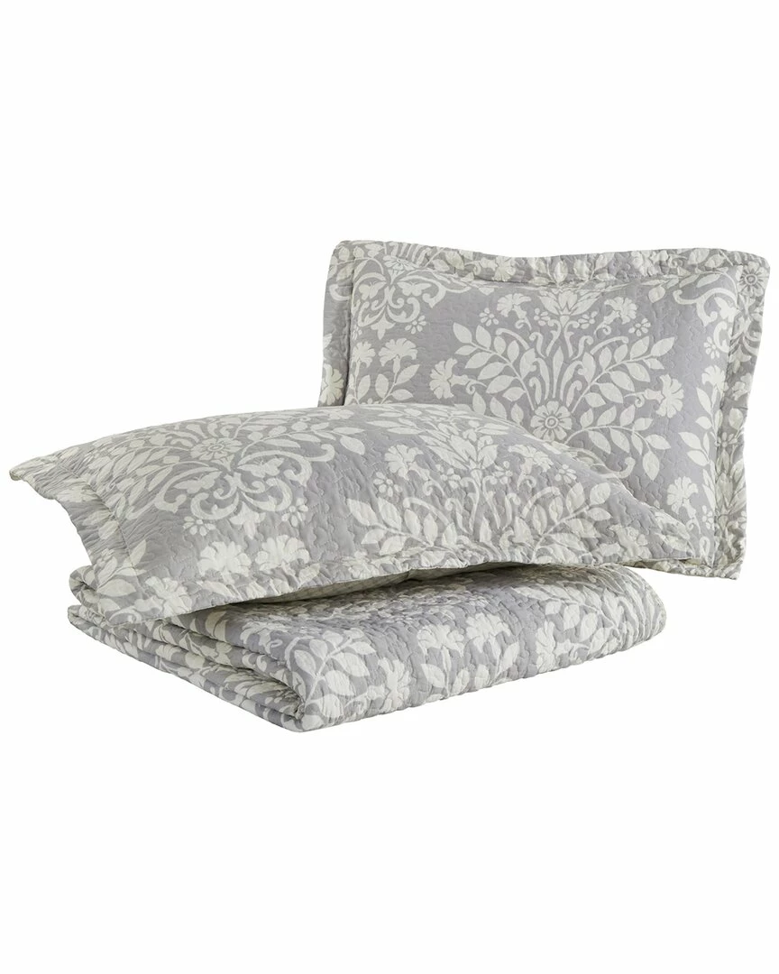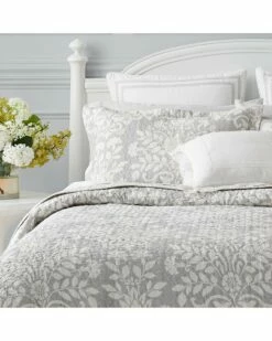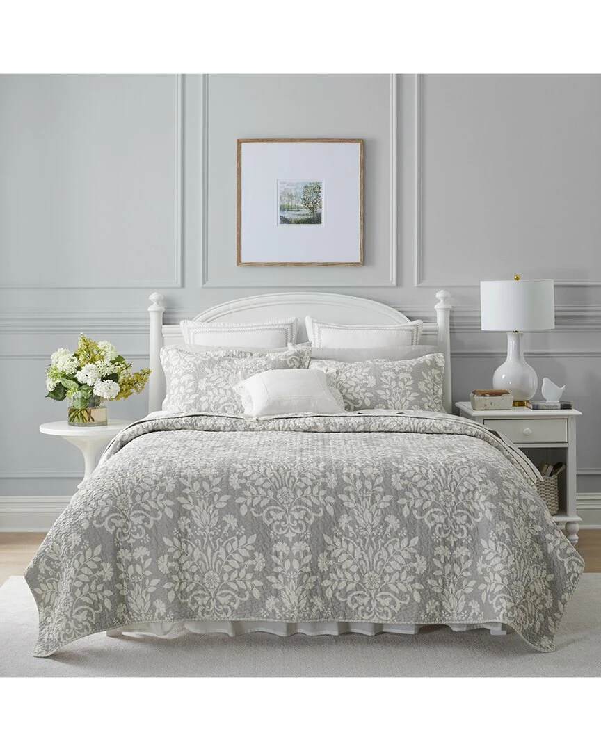 - Design details: lightweight yet warm, ideal for year-round use and layering; pre-washed for extra softness, filled with a blend of 80% cotton 20% polyester for warmth and durability, included shams have a back envelope closure, laura ashley is conscious of the environment: we have eliminated plastic from packaging – quilt sets are neatly folded and secured with a ribbon; cotton is biodegradable and requires less energy to process than other fibers, ivory floral damask print on a medium dove grey ground, reverses to a diamond lattice print in medium grey on ivory
