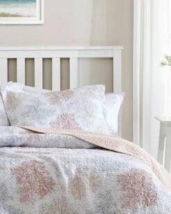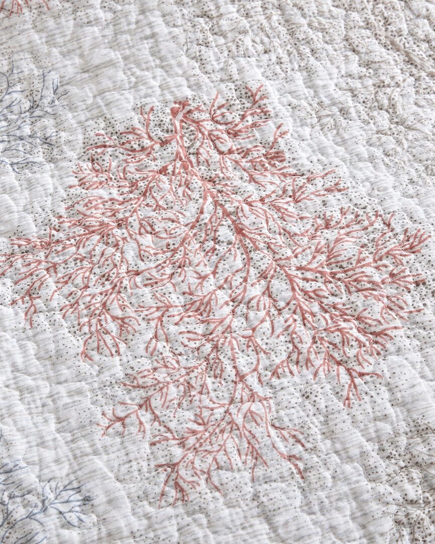 - Design details: delicate seaweed branches floating on a watery background bring the beauty of an underwater garden to your bedroom in the saltwater quilt set. coral, peach, beige and grey accents on a crisp white ground with subtle grey stripes are cool and serene for a tranquil night sleep. the quilt reverses to a crisp white dot on bright coral. prewashed for softness, this 100% cotton quilt set becomes cozier with each wash. filled with a blend of 80% cotton/20% poly it is light weight yet can be layered for year-round use. set includes one quilt and two shams for full/queen and king size, one sham for twin size. machine washable for easy care