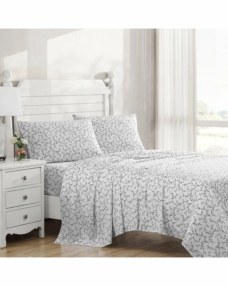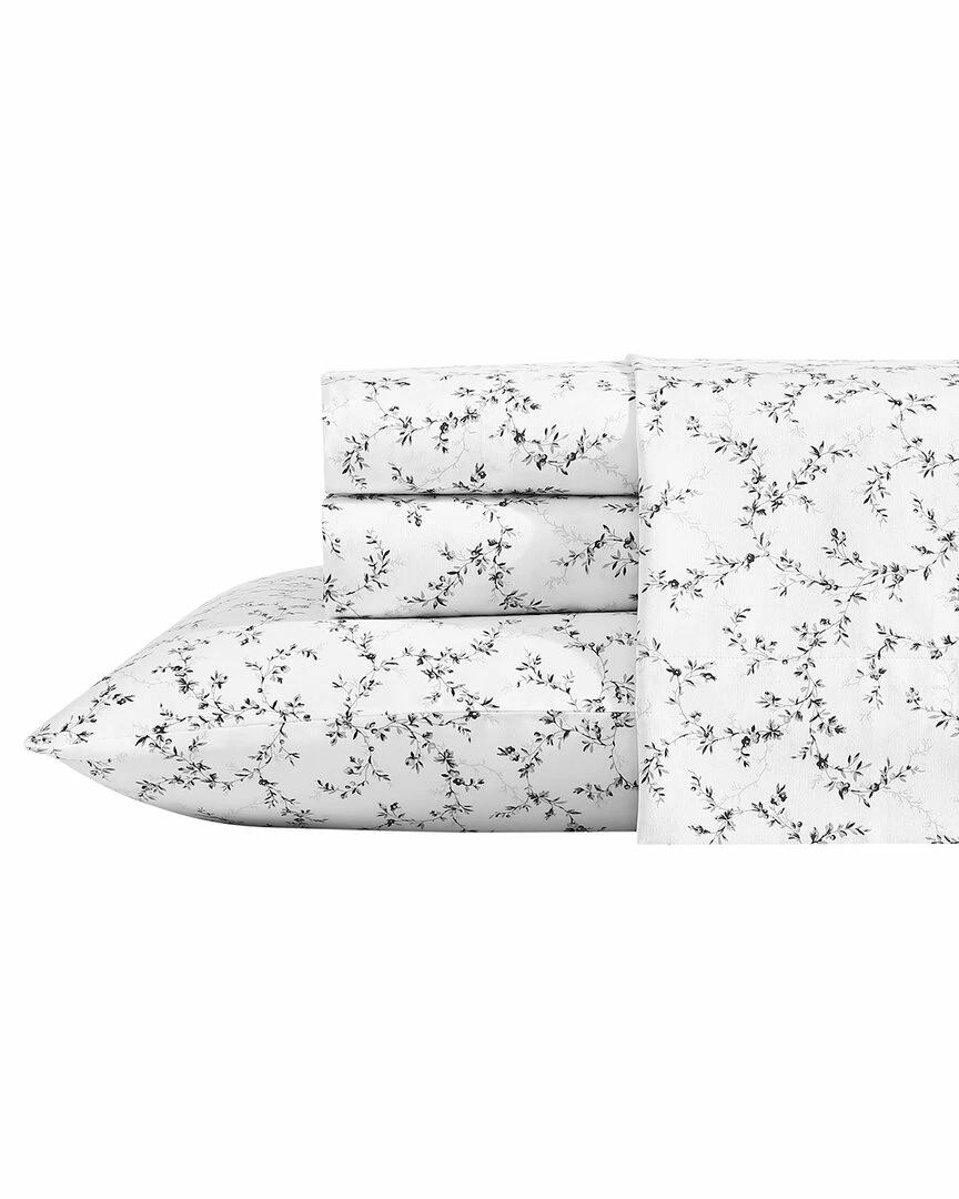 - Design details: sateen cotton sheets promote a good night’s sleep; smooth, sleek and soft; single ply, set includes a fully elasticized fitted sheet- premium encased elastic runs continuously around all four sides to keep the fitted sheet in place; 15″ fitted sheet pocket depth – fitted sheet fits mattress up to 18″, pillowcases have a standard opening with 4″ hem, oeko-tex certified, the mark of excellence for products that are healthy for you and healthy for the environment, laura ashley sara’s sprig cotton sateen sheet includes black and grey shadowy vines on white for a unique neutral floral look