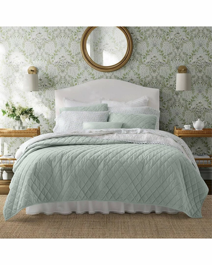 - Design details: this extremely soft plush velvet quilt is lightweight for year-round use. ideal for layering., quilted fill: 100% polyester, included shams feature a 2 piece back envelope closure; decorative pillow cover has a zipper closure, oeko-tex standard 100 certified. tested to ensure this product does not include any harmful substances., the Laura Ashley diamond velvet quilt features a soft sage green face and reverse of the quilt, sham and pillow cover