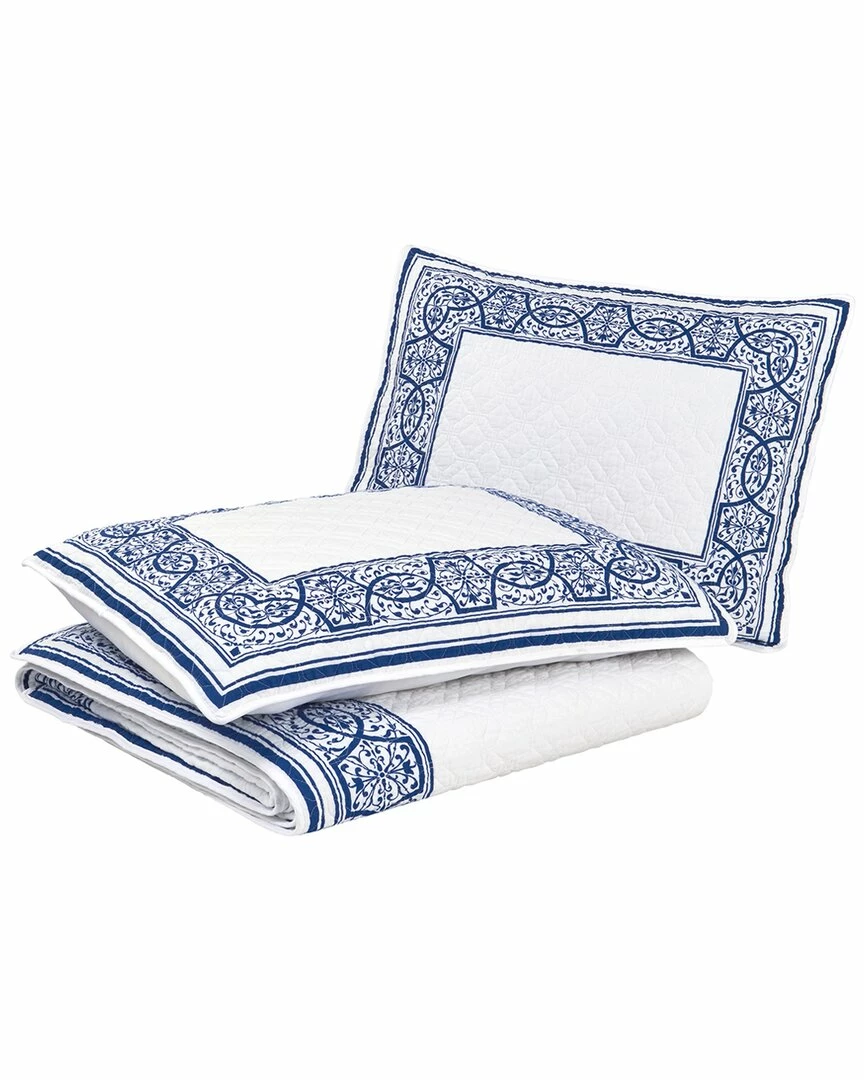 - Design details: make an elegant statement with the stunning vivian quilt and shams from laura ashley. a gorgeous deep blue tile print borders the clean white quilt, enhanced by a circular geometric quilt stitch. reverses to solid white. this eye-catching design is a timeless addition to any bedroom. prewashed for softness, this 100% cotton quilt set becomes cozier with each wash. filled with a blend of 80% cotton/20% poly it is light weight yet can be layered for year-round use. quilt and shams sold separately. machine washable for easy care